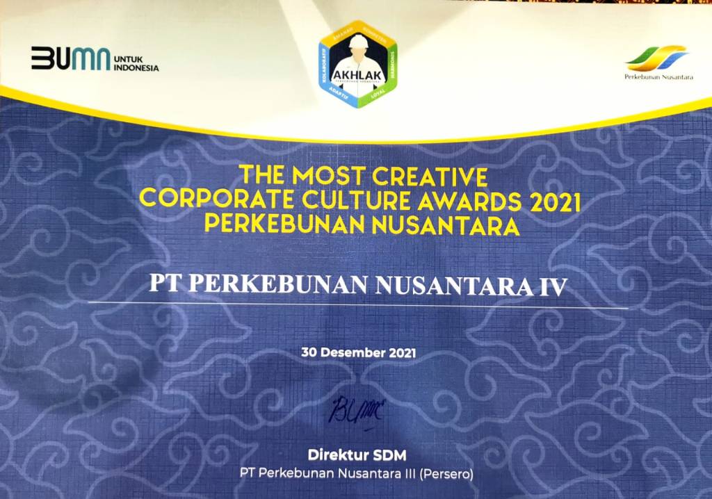 Dilansir dari situs resmi PTPN4 – PT. Perkebunan Nusantara IV kembali meraih penghargaan untuk kategori “The Most Creative” pada ajang Corporate Culture Awards Perkebunan Nusantara Group Tahun 2021, yang diselenggarakan Holding Perkebunan di LPP Agro Nusantara Yogyakarta, secara offline dan online pada Kamis, 30 Desember 2021`.