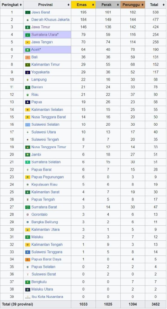 Sementara itu, Aceh yang juga menjadi tuan rumah menempati posisi keenam dengan 65 emas, 48 perak, dan 79 perunggu.
