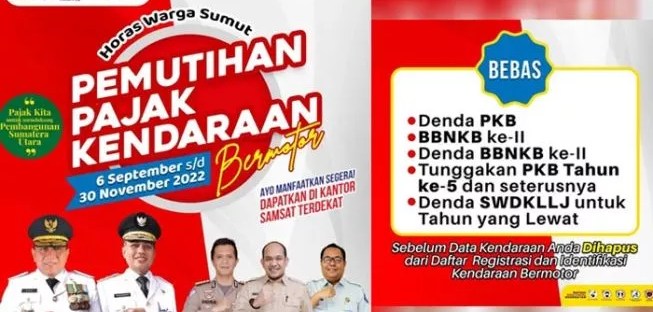 Pemerintah Provinsi (Pemprov) Sumut kembali menggelar program pemutihan pajak kendaraan bermotor tahun 2022.Dilihat SuaraSumut.id dari akun Instagram @bbprdsu Kamis (1/9/2022), pemutihan pajak dimulai dari 6 September hingga 30 November 2022.Program ini berlaku kepada masyarakat yang memiliki kenderaan bermotor di Sumatera Utara (Sumut). Program Pemutihan Pajak Kendaraan 2022 di Sumut. [Instagram] Selama program berlangsung maka pemilik… Lanjutkan membaca Pengumuman, Ada Program Pemutihan Pajak Kendaraan 2022 di Sumut, Catat Tanggalnya